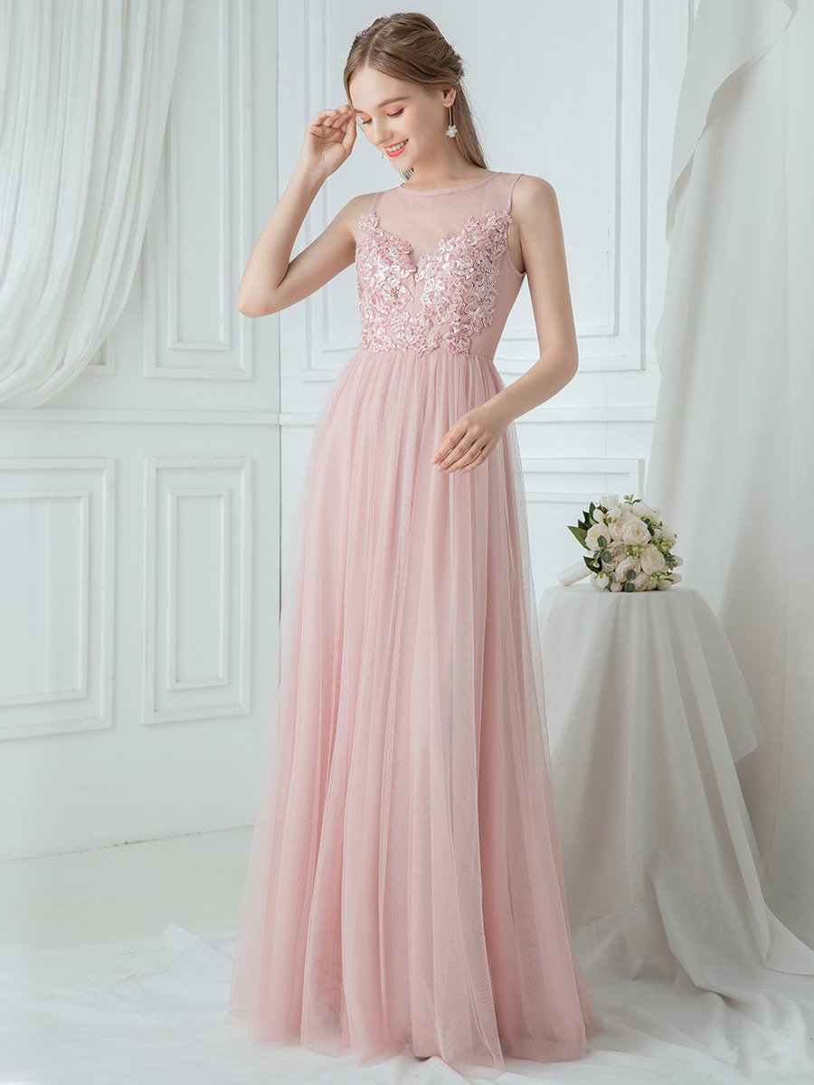 Introducing our Elegant See Through Round Neck Tulle Applique Bridesmaid Dress. With its delicate and feminine applique on the bust, this dress exudes a romantic and elegant vibe. The classic sheer round neckline and flowy tulle skirt make it the perfect choice for weddings in spring and summer. Elegant, sophisticated, and made with high-quality polyester fabric.