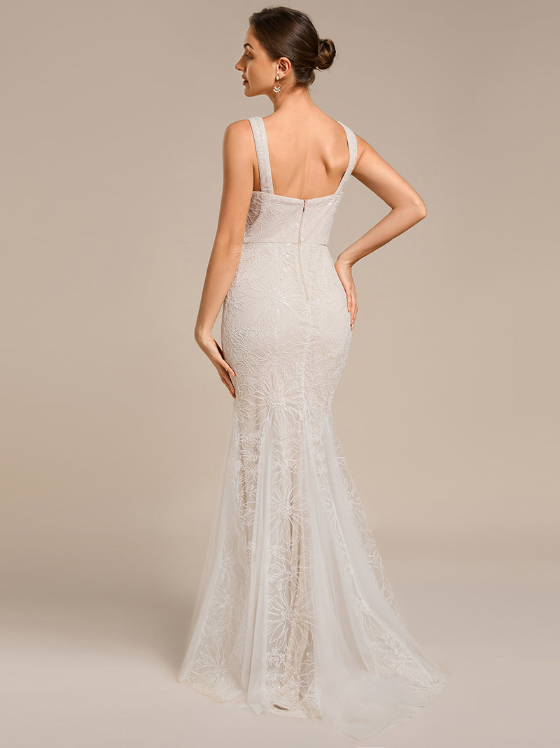 Elegant square neckline bridal gown, a bodycon silhouette flowing to floor-length. Crafted from shimmering polyamide with delicate embroidery and paillette details, it hugs curves gracefully.