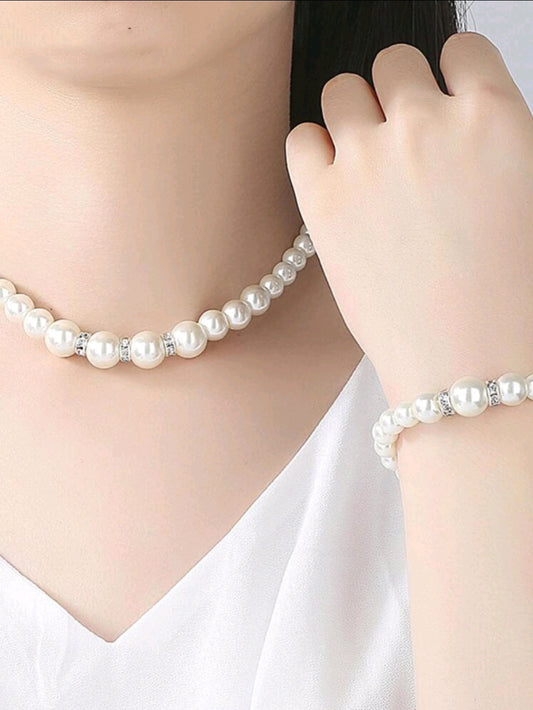 Faux Pearl Beaded Necklace & Earrings & Bracelet